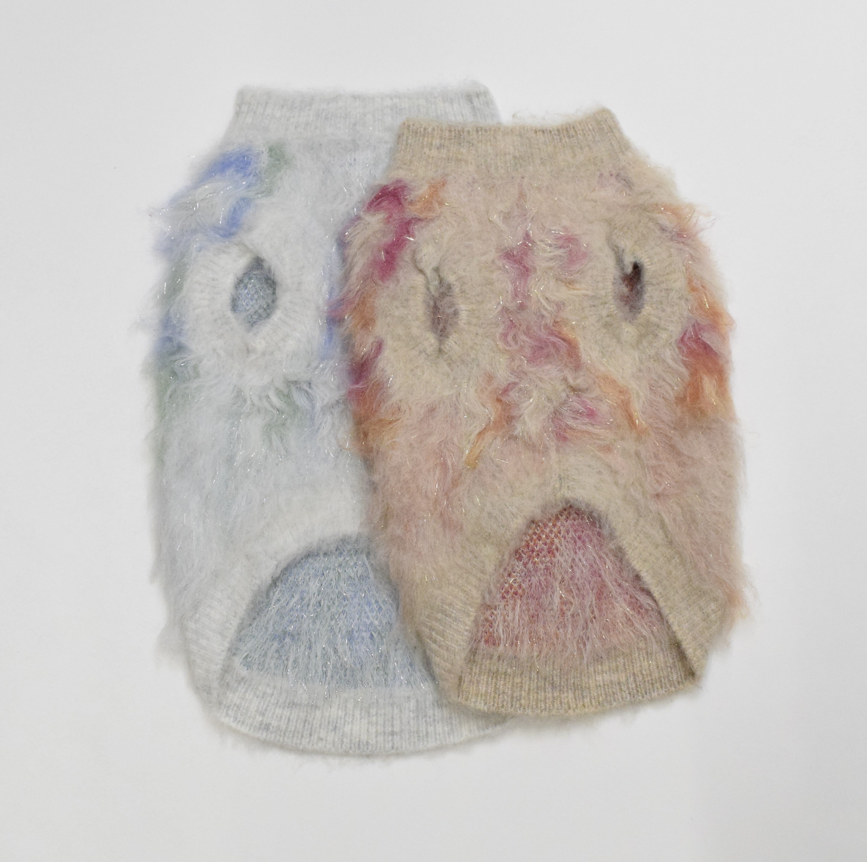 ラメが撚糸されたフェザーヤーンとモチっとした糸をマーブル柄にジャガード編みされています。さらに、特殊な起毛加工が施され、まるで柔らかい羽毛に包まれているかのような贅沢な肌触りを実現しました。