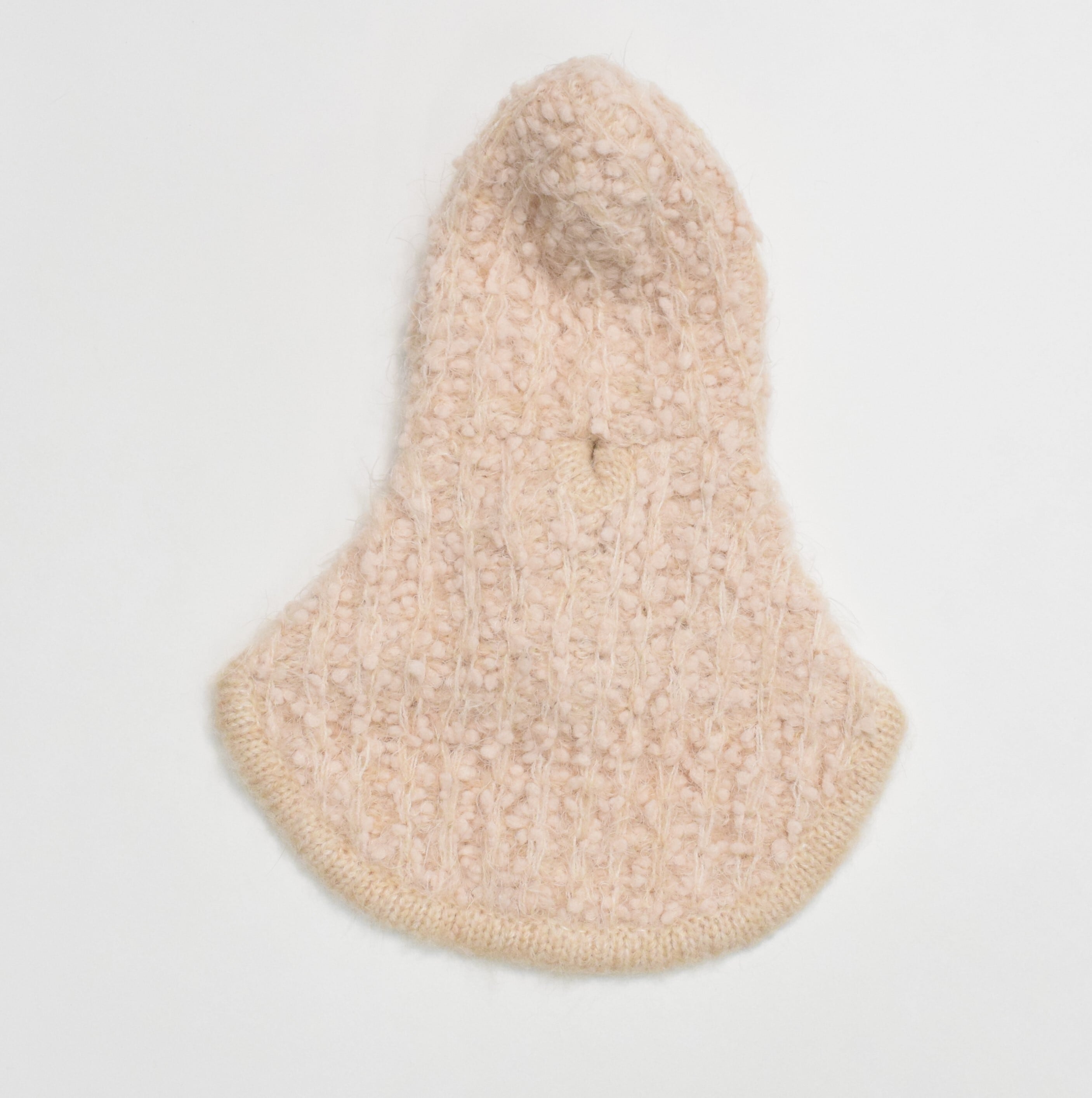 ポコポコとした表情感が魅力のHYGGELEでは新アイテムのニットポンチョが登場しました!HYGGELE独自の素材を使用したこのフード付きニットポンチョは、フェザーヤーンと特別な糸をMIXしており、どこか暖かみのある印象を与えます。リードを通す穴も備えているので、お散歩時にも便利です。